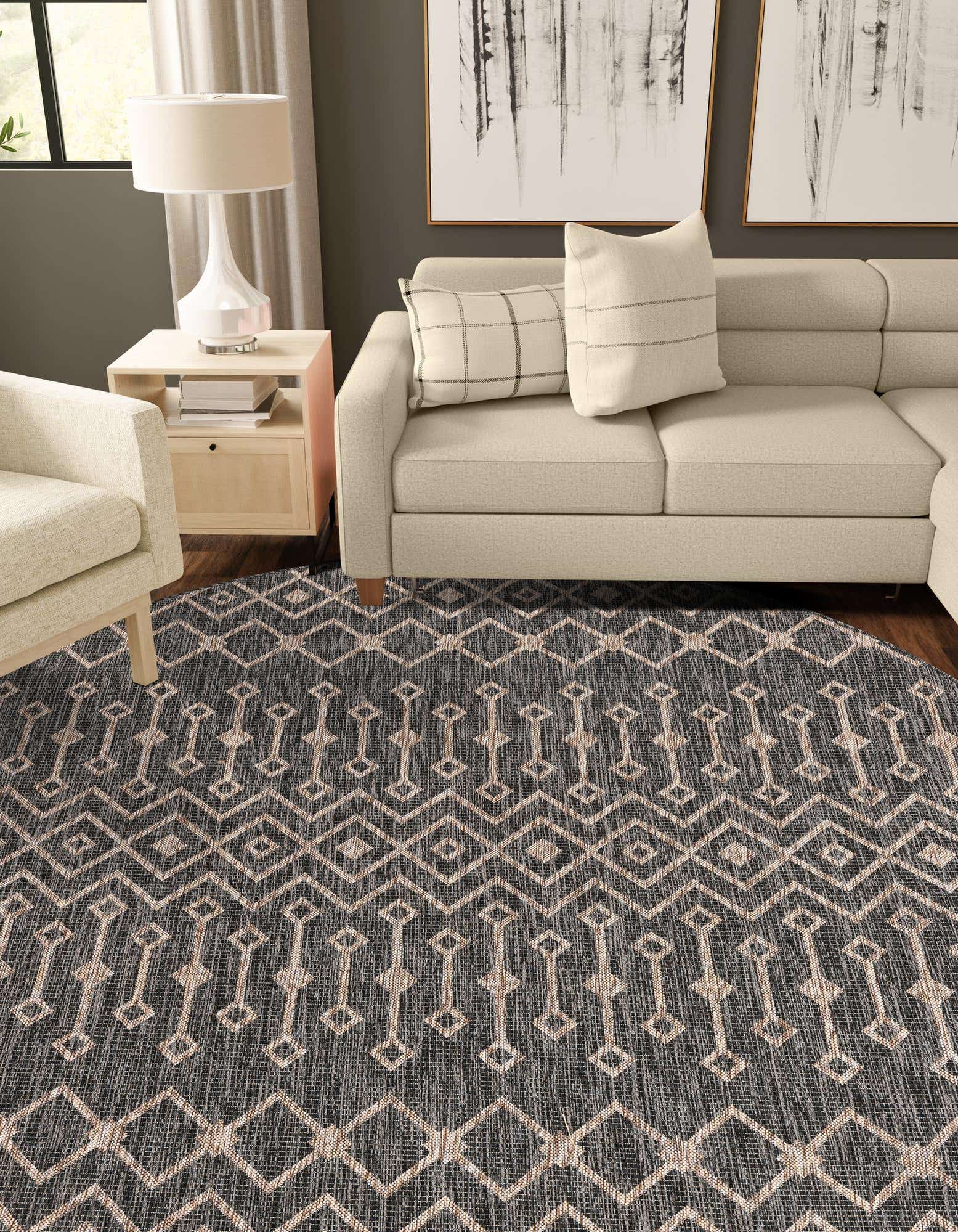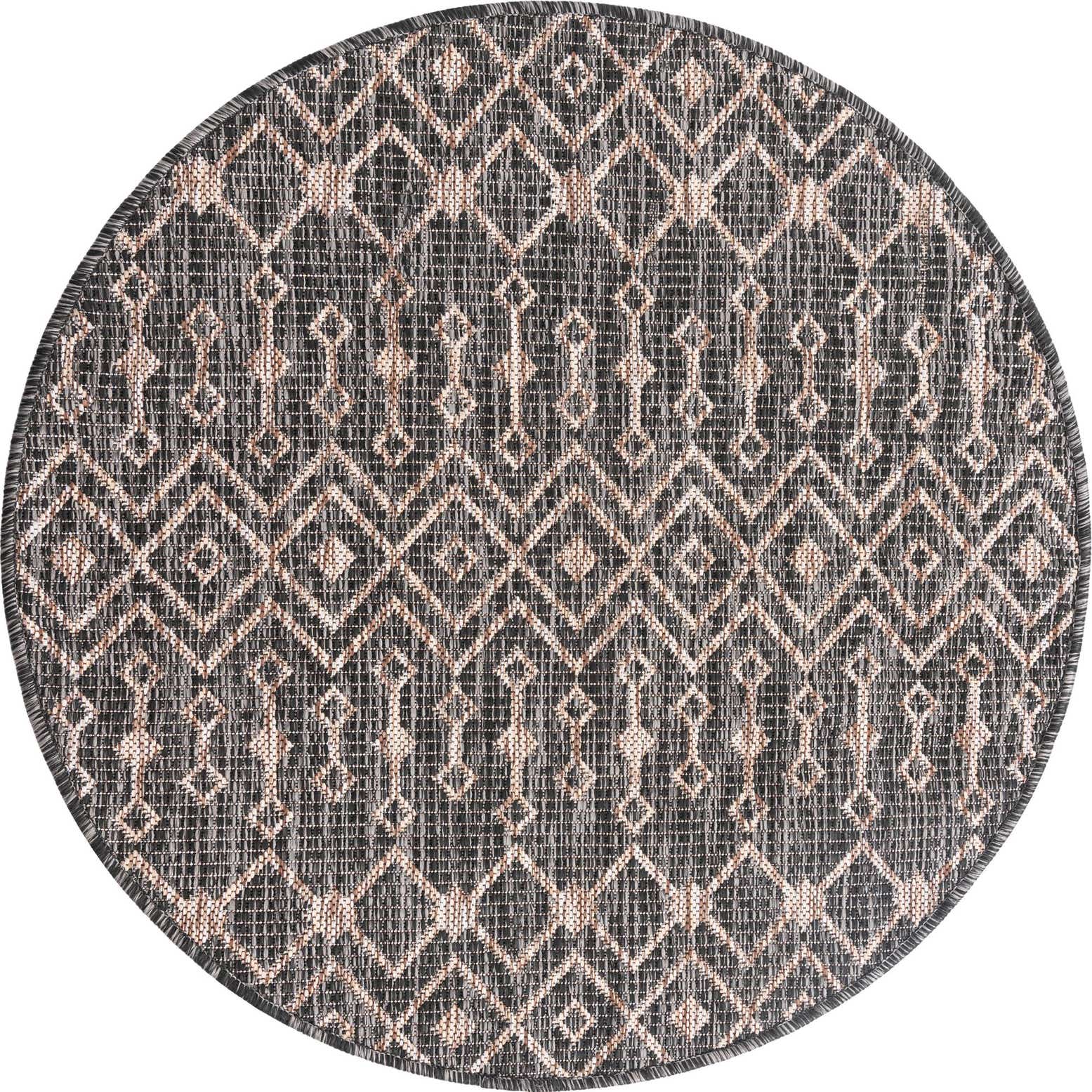 Modernes Design: Der Tulum Teppich zeichnet sich durch ein wiederkehrendes Muster aus miteinander verbundenen Diamantformen aus, das auf einem dunklen Hintergrund für Kontrast und visuelles Interesse sorgt. Dieses Design verleiht dem Teppich einen zeitgemäßen und stilvollen Look, der jede Outdoor-Einstellung ergänzt.