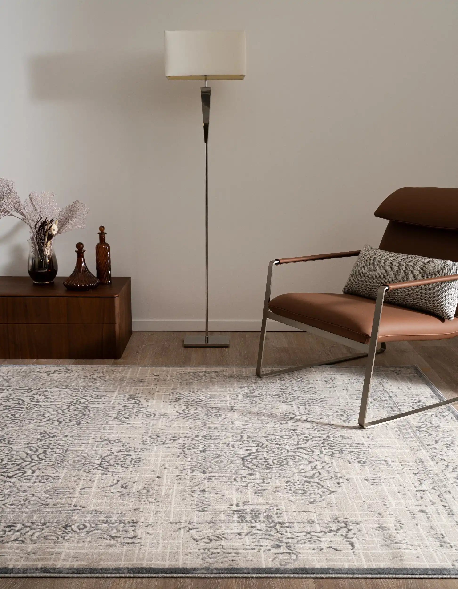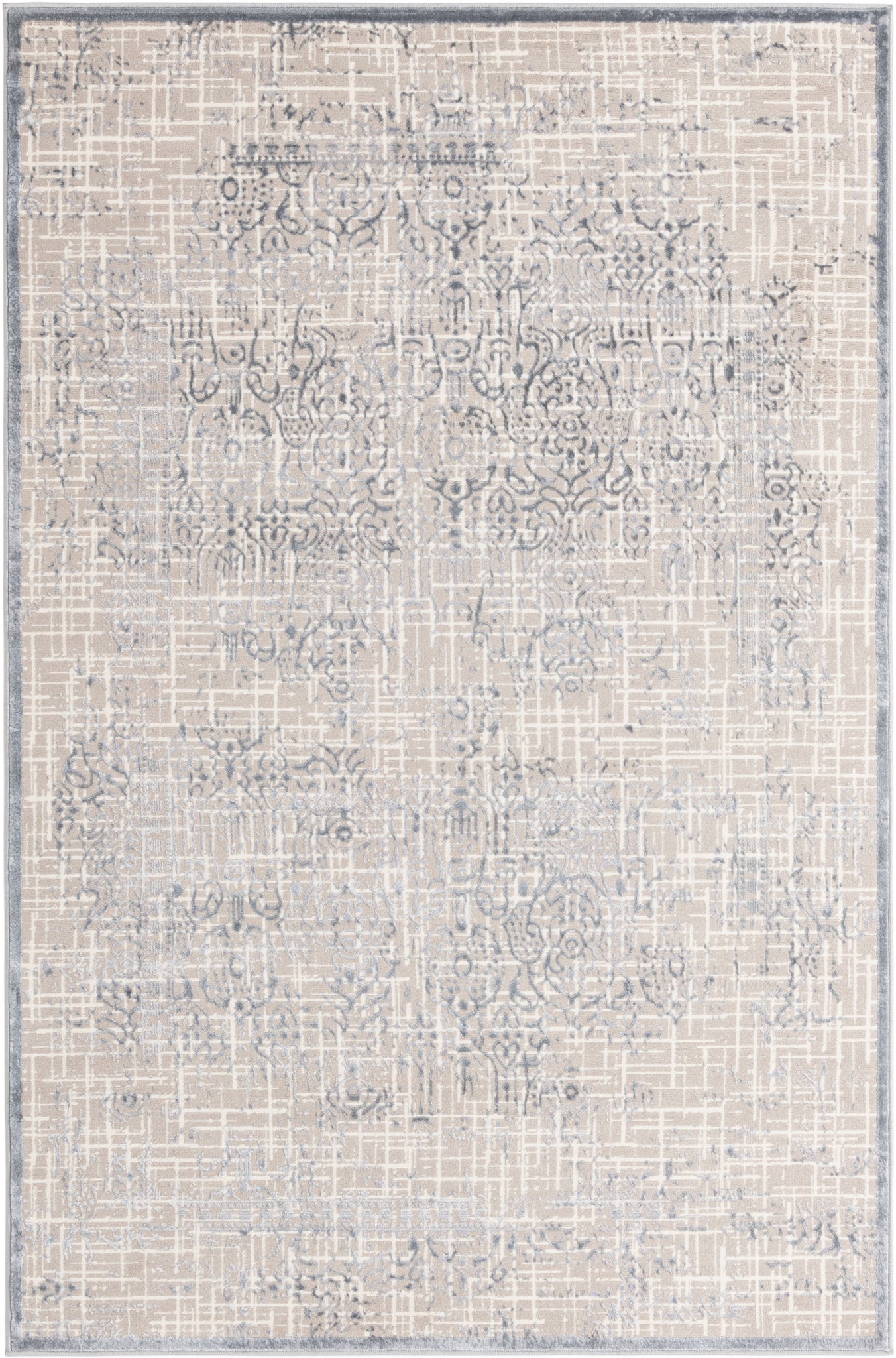 Elegantes Design: Die Bern Kollektion besticht durch seine schlichten Farben und den feinen Schimmer, der jedem Raum eine subtile Eleganz verleiht. Das zentrale, ornamentale Muster verschmilzt sanft mit dem modernen Distressed-Look am Rand und schafft so ein einzigartiges Designelement.