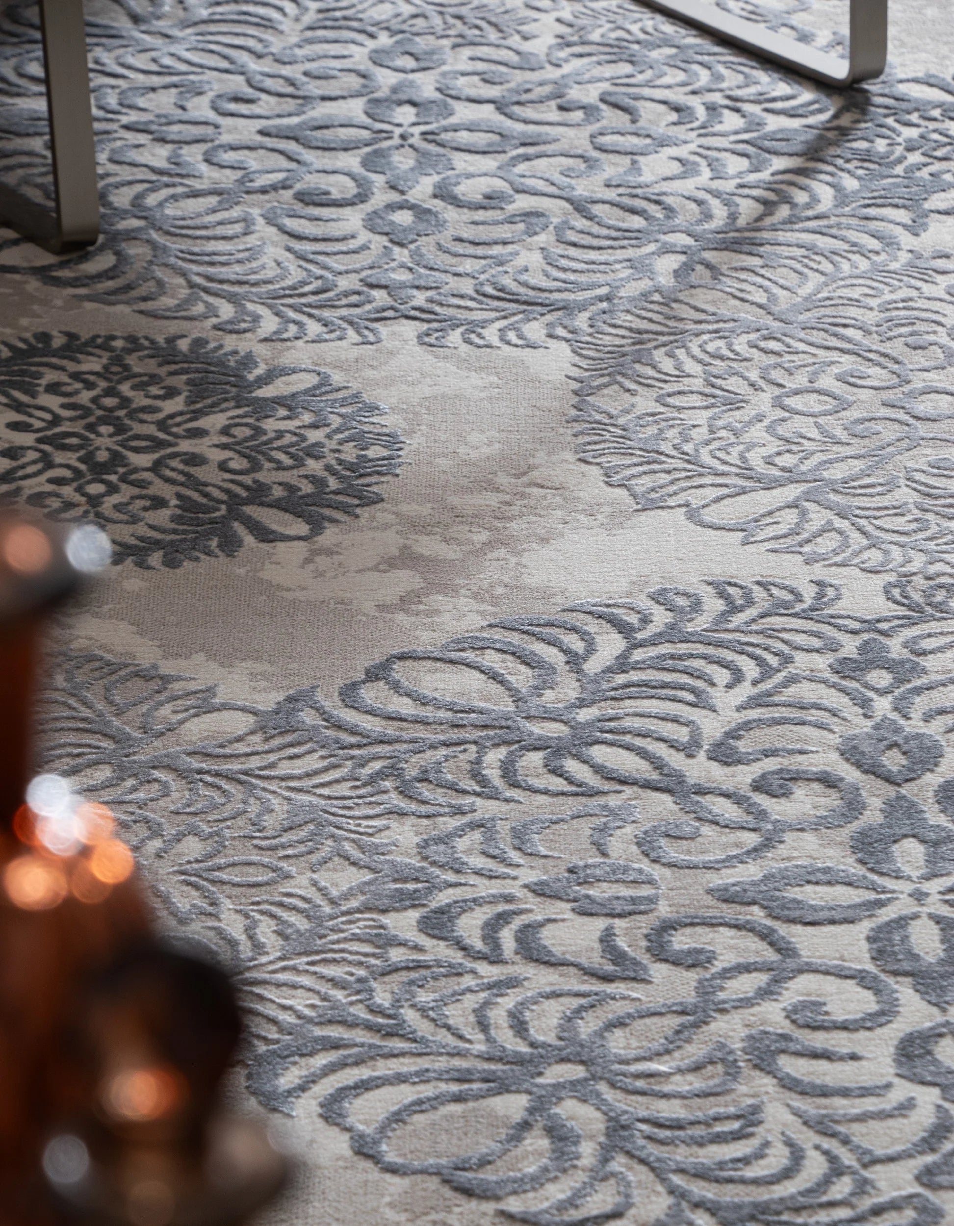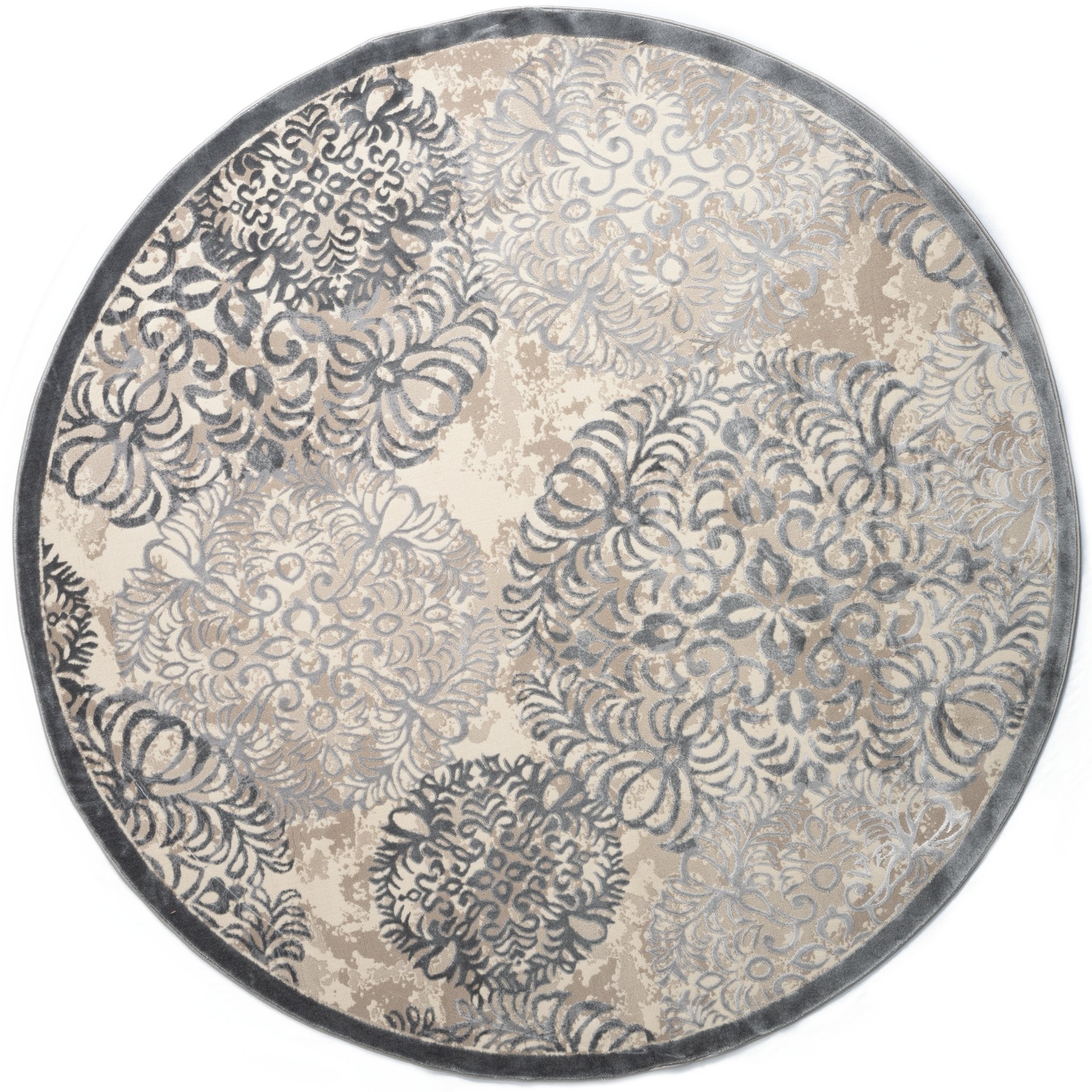Elegantes Design: Die Bern Kollektion besticht durch seine schlichten Farben und den feinen Schimmer, der jedem Raum eine subtile Eleganz verleiht. Das zentrale, ornamentale Muster verschmilzt sanft mit dem modernen Distressed-Look am Rand und schafft so ein einzigartiges Designelement.
