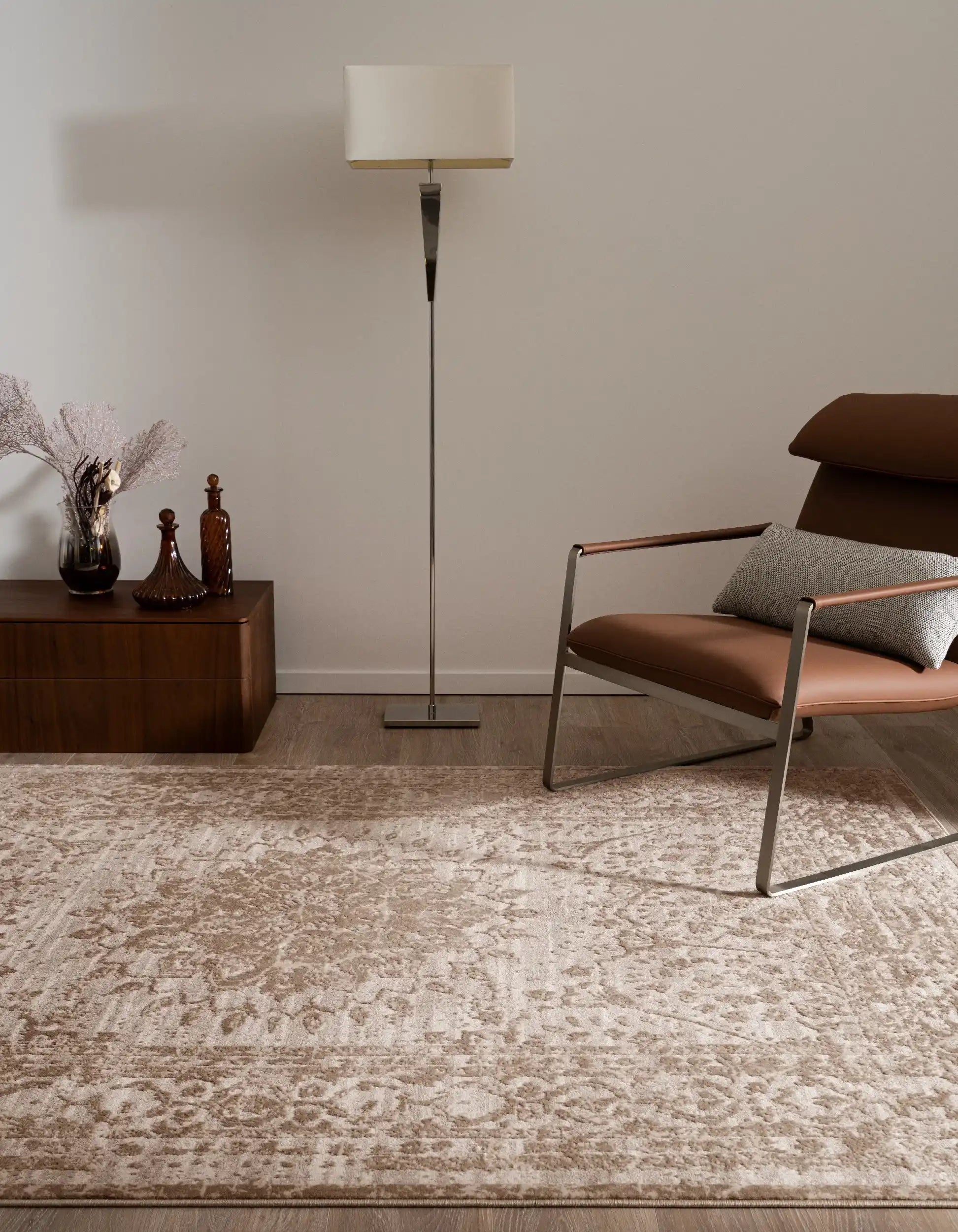 Elegantes Design: Die Bern Kollektion besticht durch seine schlichten Farben und den feinen Schimmer, der jedem Raum eine subtile Eleganz verleiht. Das zentrale, ornamentale Muster verschmilzt sanft mit dem modernen Distressed-Look am Rand und schafft so ein einzigartiges Designelement.